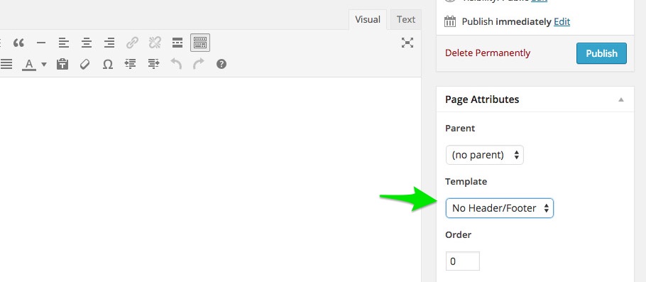 To remove the header and footer on a per-page basis, create a new page and then select the No Header/Footer template in the page attributes meta box, as shown in the screenshot below.