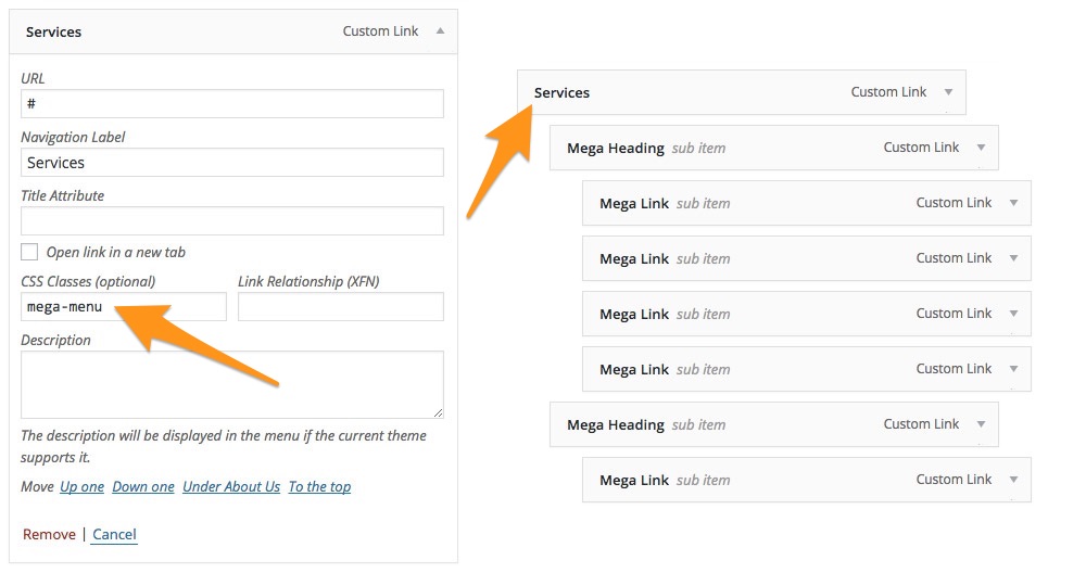 In the screenshot below, the target top-level item is Services. - In the CSS Classes field, enter mega-menu, as shown in the screenshot.