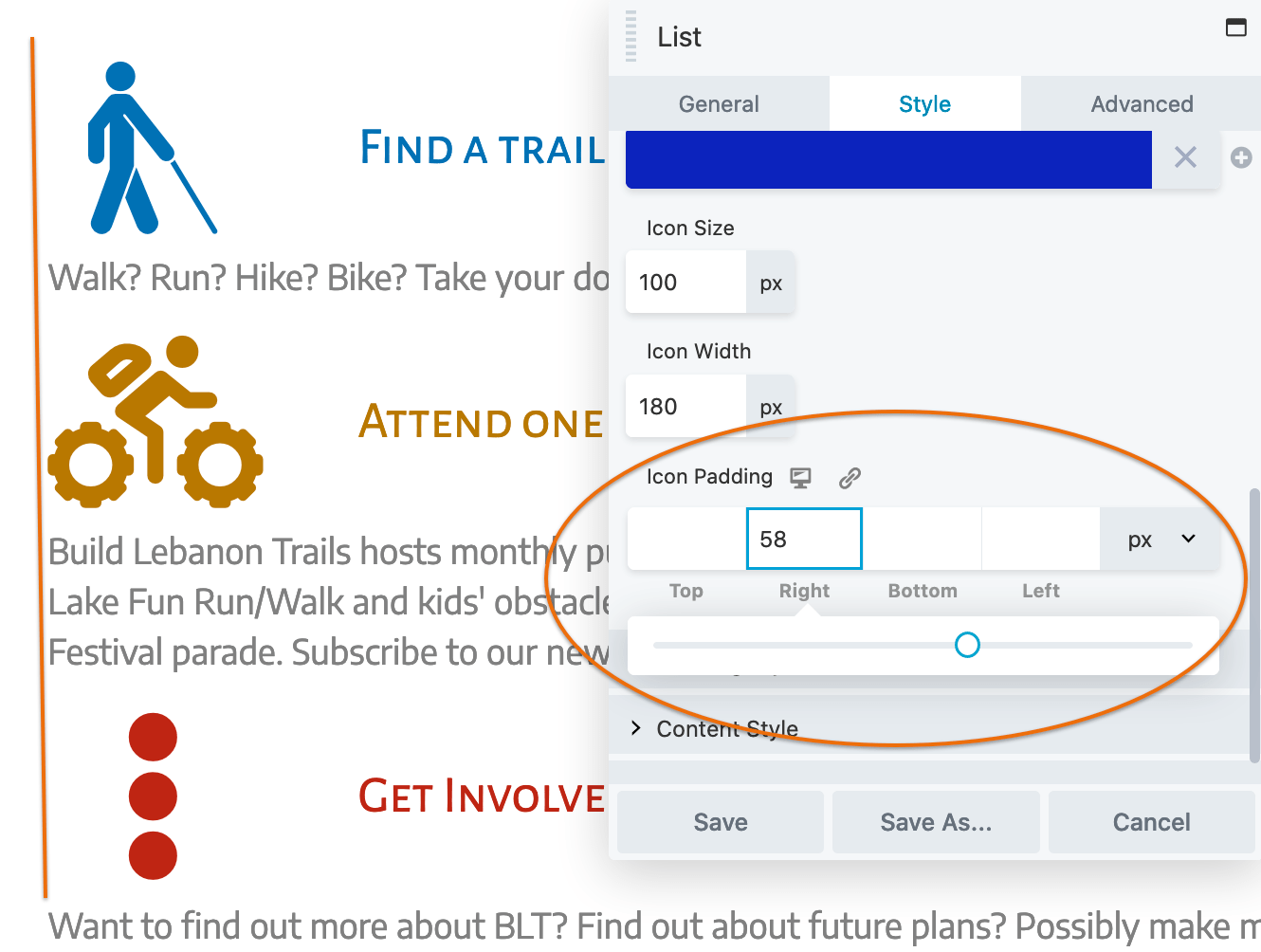 • Icon padding (responsive) Increases padding between the icon and icon's border-box. If you have icons on the left, increasing the left icon padding indents the line and increasing the right icon padding increases the space between the icon and the text, as shown in this screenshot. To adjust the vertical position of the icons, tweak the top or bottom padding.