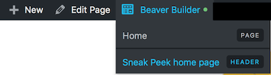 If you're viewing a regular page and mouse over the Beaver Builder link, you'll see options to edit the page itself or any of the Themer layouts that apply to that page. For example, in the following screenshot you can choose to open either the page that you're viewing in Beaver Builder, or the Header-type Themer layout called "Sneak Peek home page," which is controlling the header on that page.