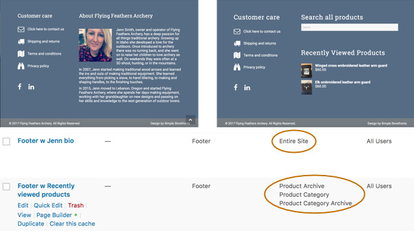 The Footer-type Themer layout on the right applies to product category and product archive pages, with a customer care section, a search box for products, and a list of recently viewed products. Beaver Themer has integrations with WooCommerce, Easy Digital Downloads, and The Event Calendar plugins, with special modules that make it easy to display this type of information and limit the locations in which it appears.