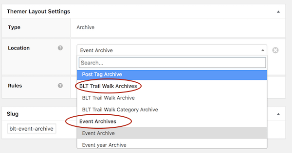 Themer layouts work for custom post types as well as standard WordPress pages and posts. Once you have created a custom post type (using your own code or a plugin like Pods or Custom Post Type UI), it will automatically show up in the list of Locations for your Themer layout, as in the screenshot example below, where two custom posts types show up at the bottom of the list of locations for an Archive layout.