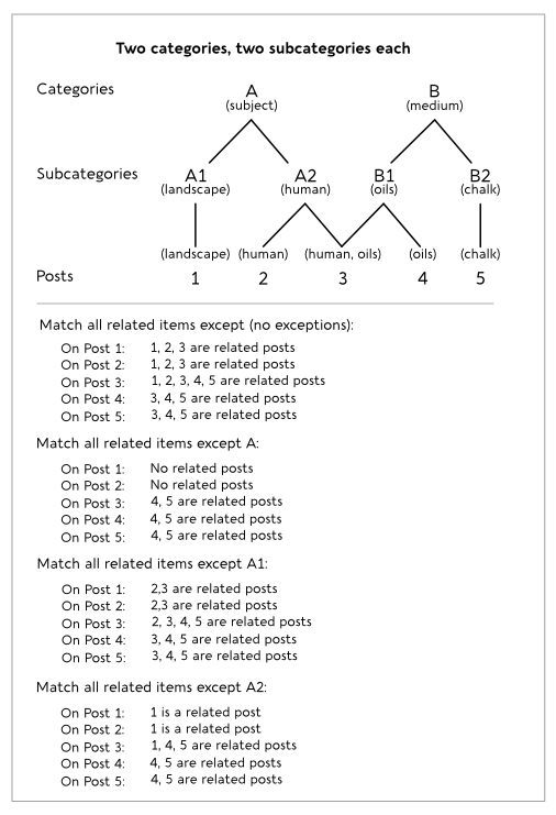 If you specify Match all related categories except with no exceptions, the diagram shows which items appear in the Related Posts list on each page. (If you've set the option to exclude the current post, the current post is eliminated from the list.)