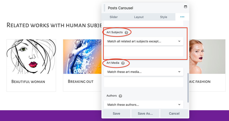 The first two examples use a Posts/Carousel/Slider module to set up a related posts section in a Singular-type Themer layout. The third example sets up a related posts section in a saved layout template that is applied to standard pages.