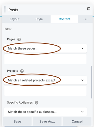 For the Related Projects section, the Posts module's Filter section includes a setting for the custom taxonomy Projects, and Match all related Projects except is selected, plus the Exclude current post setting: