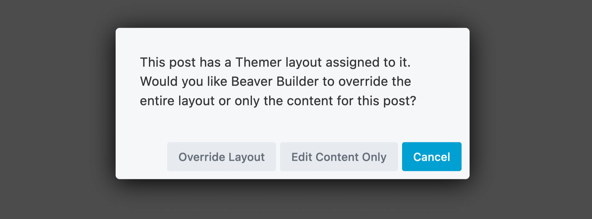 This post has a Themer layout assigned to it. Would you like Beaver Builder to override the entire layout or only the content for this post?